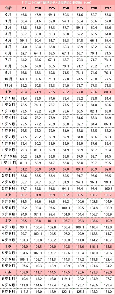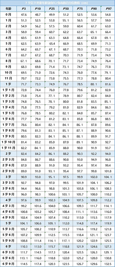 家長可以對照下面由衛(wèi)健委發(fā)布的《7 歲以下兒童生長標(biāo)準(zhǔn)》,根據(jù)孩子的性別、年齡,找到孩子身高所處的區(qū)間,了解寶寶身高是否達(dá)標(biāo)。