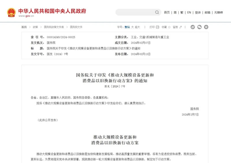 《推動大規(guī)模設(shè)備更新和消費(fèi)品以舊換新行動方案》的通知